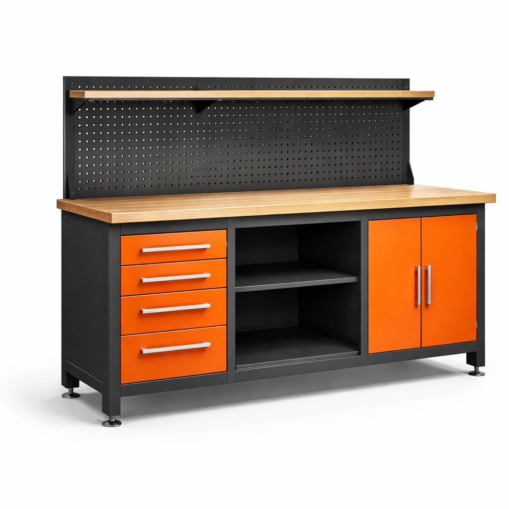 Werkbank metall mit holzarbeitsplatte schwarz orange