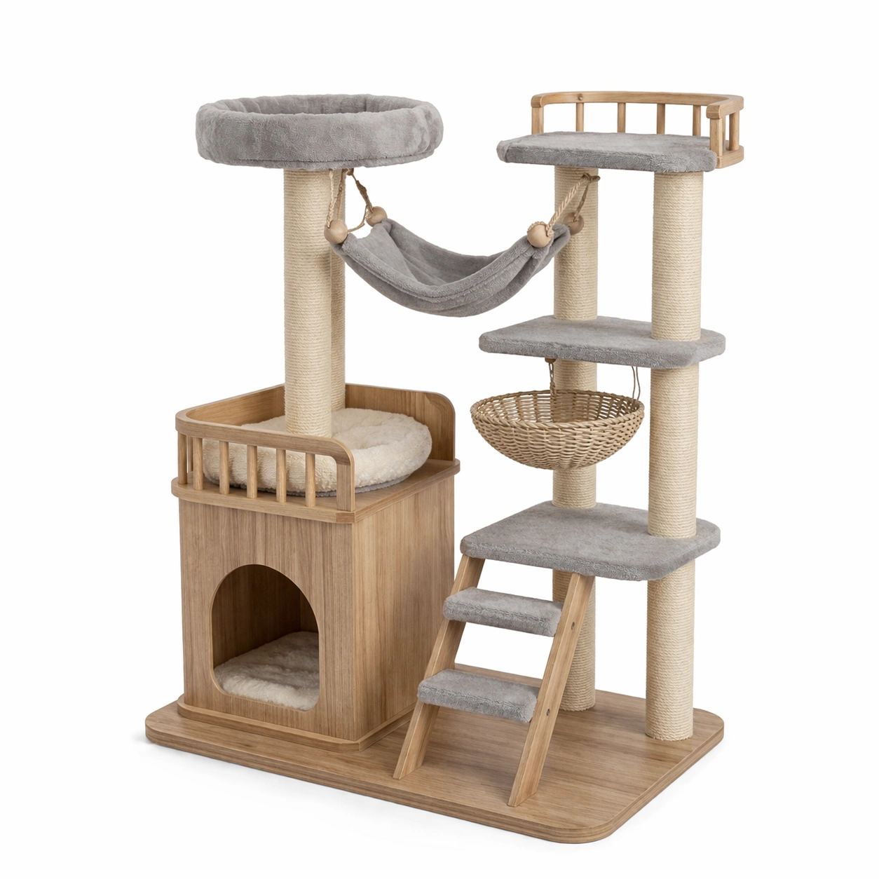 - Zubehör: Plüschbett, Hängematte aus Polyester, Korb aus Rattan, Treppe